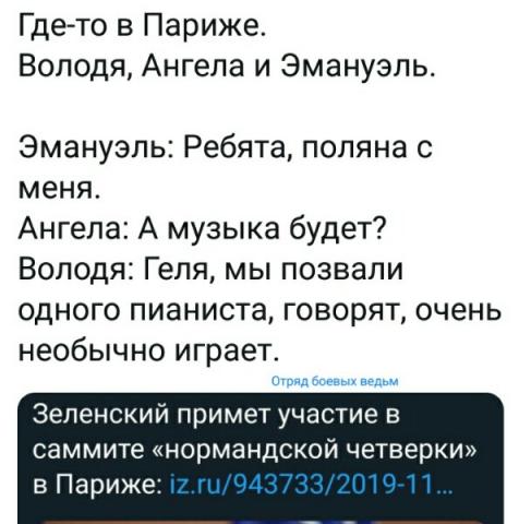 А также Минск-2, Минск-3, развод войск, выборы, контроль над границей, Нормандский формат, Северный поток и амнистия. Все действие происходит в Нормандском формате.