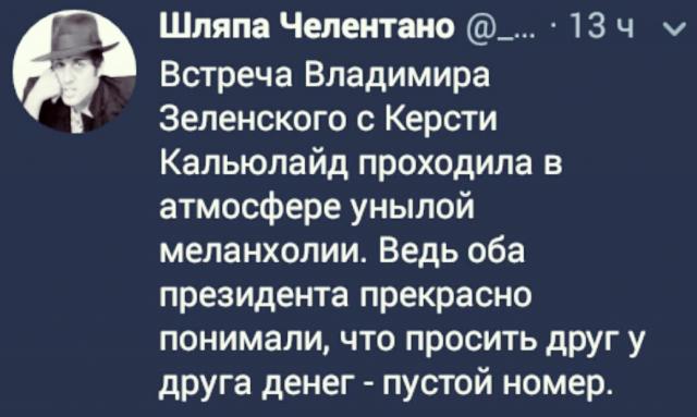 Встреча Владимира Зеленского с президентом Эстонии Керсти Кальюлайд проходила в атмосфере унылой меланхолии. Ведь оба президента прекрасно понимали, что просить друг у друга денег бессмысленно.