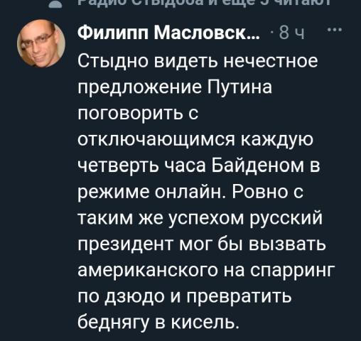 Очевидно, что режим падет уже вот-вот. Путин, в агонии цепляясь за власть, пытался сдуть Байдена с трапа самолета, но Джо удержался на радость всему демократическому миру.