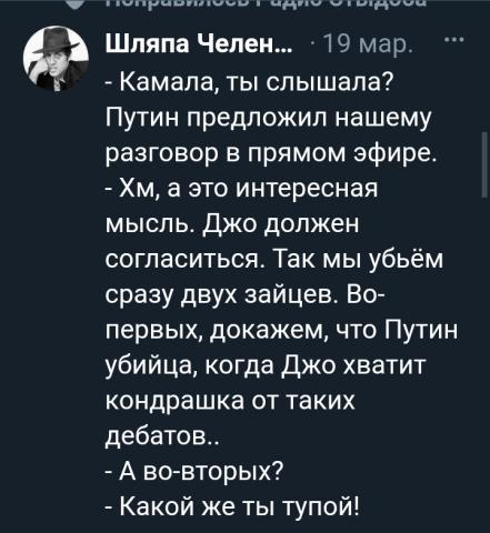 - Камала, добрый вечер, у вас севший голос, здоровья вам, позовите, пожалуйста, Джозефа Байдена к телефону.