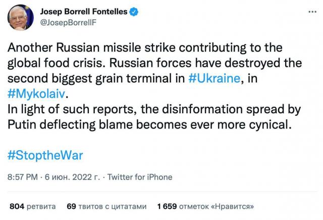 Высокий представитель ЕС по иностранным делам Жозеп Боррель заявил, что «авиаудар российских ВКС 4 июня» повлек пожар на зернохранилище в Николаеве, уничтоживший второй по величине склад с зерновым шротом в Украине. Об этом он написал в Twitter.