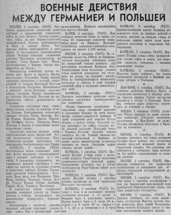 «По сообщению Германского информационного бюро, сегодня утром германские войска в соответствии с приказом германского верховного командования перешли германо-польскую границу в различных местах. Соединения германских военно-воздушных сил также отправились бомбить военные объекты в Польше», — говорилось в сообщении ТАСС, датированном 1 сентября. В газетах они появились 2 сентября. «Известия», кроме того, писали об объявлении всеобщей мобилизации в Англии и Франции, обещавшим Польше поддержку в случае нападения Германии.