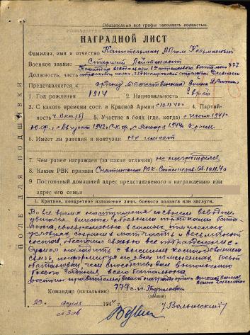 Старший лейтенант Абрам Кельманович Капительман - член ВКП(б), командир взвода связи 1 стрелкового батальона 77 стрелкового полка 227 Темрюкской стрелковой дивизии.