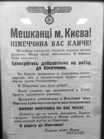 Большевистские комиссары разрушили ваши фабрики и рабочие места и таким образом лишили вас зарплаты и хлеба. Германия предоставляет вам возможность для полезной и хорошо оплачиваемой работы. 28 января первый транспортный поезд отправляется в Германию. Во время переезда вы будете получать хорошее снабжение, кроме того, в Киеве, Здолбунове и Перемышле -- горячую пищу. В Германии вы будете хорошо обеспечены и найдете хорошие жилищные условия. Плата также будет хорошей; вы будете получать деньги по тарифу и производительности труда. О ваших семьях будут заботиться все время, пока вы будете работать в Германии. Рабочие и работницы всех профессий -- предпочтительно металлисты в возрасте от 17 до 50 лет, добровольно желающие поехать в Германию, должны объявиться на БИРЖЕ ТРУДА В КИЕВЕ ежедневно с 8 до 15 часов.