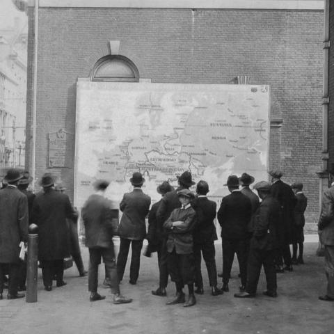 Люди разглядывают карту новой Европы после Первой мировой войны, США, 1918 год