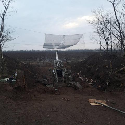 Американская 155-мм гаубица М777 и противоланцетная сетка над ней, поскольку российские дроны-камикадзе стали настоящим проклятием для украинской артиллерии.