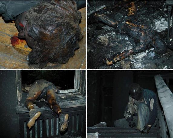 По словам Юрия, по отношению к ним сразу же применили травматическое и огнестрельное оружие. "Парня, находившегося возле меня, сразу же "уложили". Нас загнали внутрь здания и отрезали все пути отхода. Я очутился в правом крыле 3-го этажа, нас человек десять было в какой-то комнате. Правосеки начали забрасывать здание "коктейлями молотова" и стрелять по окнам. Первый этаж горел, потом - выше, дым распространился по коридорам, выйти было нельзя... Мы открывали и выбивали окна, но это не спасало: дым с улицы затягивало в помещение. Кто-то выпрыгивал, их внизу добивали. Снизу кричали "Слава Украине" и "Смерть врагам"... Это был ад! Приехали пожарники, начали тушить 1-й этаж..." - рассказывает очевидец.