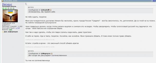 Це дуже неприємно для військових, державних керівників України, міжнародних діячів, - громадяни втрачають віру: у швидку перемогу над бандитами Росії; в ефективність міжнародних заходів по вирішенню воєнних російсько-українських проблем... До того ж ганебну роль грають проФСБЕшні потвори із інтернетівських форумів на сторінках соціальних мереж, у них жахлива пропаганда. Наприклад, показують картинку, в родині загинула одна дитина, а друга скалічена, з відірваними кінцівками лежить, синхронно із цією картинкою кричать: "Паращенко фашист, його потрібно знищити!". Не розуміючи навіть, що знищувати дійсно потрібно, тільки не Порошенка, а Путіна, бо згадайте цього нелюдя ФСБешного, як він підривав в Москві житловий будинок, на вул.Гурьянова 19, (здається), щоб створити суспільну свідомість таку, щоб почати війну із Чечнею; як кричав, що він буде "мочіть в сартірах"; як говорив під час початку минулорічних подій в Криму: "Вот ми і посмотрім, как будут украінскіє воєнниє стрелять, когда в ніх будут стрєлять русскіє із - за спін жєнщін і дєтєй", тобто це модель війни Росії із Україною, модель війни кривавої потвори Путіна, коли русскіє, не бійці, а бандити, сидять під спідницями у жінок, ховаються за дітей, із-за спин яких стріляють в українців. Коли встановлюють свої гармати, міномети, "Гради", "Смерчі"... поміж житлових будинків, коли русскіє снайпери сидять на дахах житлових будинків, в квартирах цивільних громадян... і звідти "полівают" укропов, якщо українці не будуть з такими бандитами воювати, то вони ж стріляють, вони ж і вбивають дітей, у будь-якому випадку дітей, жінок, пенсіонерів, з тієї чи іншої сторони... бо вони ж атакують, вони ж здійснюють агресію, вони ж окуповують Україну, вони ж погрожують дійти до Львова, через Київ... Були такі бійці, які пропонували щоб Росія забрала собі тих, хто хоче бути громадянином Росії, Україна щоб забрала тих, хто хоче бути громадянином України, а бійці українські, щоб повоювали з сопливими "сосунками" типу проФСБешних шакалів і ФСБешників типу: Захарченка, Болотова, Бородая, Пушиліна... Усрался Путін, Мєдвєдєв, Наришкін... не хочуть забирати свою 5-у колону із України... Цим вони показали, що їм на х*й не потрібні руськоязичні, їм потрібна окупація території України... Усралісь сосунки... Чому сосунки? Тому що ці бандити присосалісь, присмоктались до грошей Росії, присмоктались до озброєння Росії, присмоктались до живої сили з Росії, присмоктались до "гуманітарних рейсів" із Росії, присмоктались до живого щита, до спідниць жінок, до дітей, із - за спин яких вони, по-Путіну, воюють... Ці сосунки викликають відразу... Ненавиджу гнид. До того ж більшість із них взагалі іграшки в зубах ФСБ... Тобто функціями організмів, мозками отих захарченків, керують психотронні ФСБешники із підмосковних лісів, а ці шакали все виконують, що їм наказують за допомогою біоробтотехнологій космічної медицини із Кремля, по-суті... Така ця війна, - Росія звикла воювати з малими народами, з меншими народами... Путін багато років готувався до війни із Україною. Звичайно він дуже гарно розуміє, що русскіє ФСБешниє сосунки, вони ж комуністи і КГБісти Донбасу, війну програють без допомоги Росії, тому влаштував таку жахливу пропаганду, яка і травмує душі, мозки українців, особливо молодих українців... Звичайно у війнах перемагають ті, хто сильніший, а не ті, хт