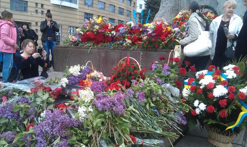Два слова о георгиевских ленточках. Сначала они встречались редко. Но у Вечного огня, не боясь обещанной расправы, десятки и сотни киевлян двигались, надев этот символ Великой Победы. Они шли мимо могилы маршала Рыбалко, памятника Ковпаку, рядом с могилами настоящих героев и к каждой плите с именем героя возлагали цветы. Тысячи цветов. У самого Вечного огня цветов оказалось столько, что они образовали живую стену. Тут же, у Вечного огня, развевались красные флаги двух гвардейских соединений Великой Отечественной. Звучали песни военных лет. Люди шли и шли потоком…