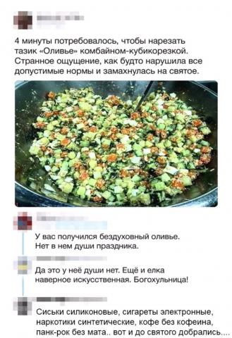 - Я всё пиздато сделал, - обиженно сказал он. - Это у вас, блядь, какой-то изврат пошёл. В древнем Риме был салат "Юпитер", с соловьиными язычками и сердцем косули, его ели в январе, чествуя бога Януса. А у вас что? Этот "Оливье" ебучий? Да его впору "Титаник" назвать. Овощи и курица, обняв друг друга от ужаса, тонут в море майонеза.