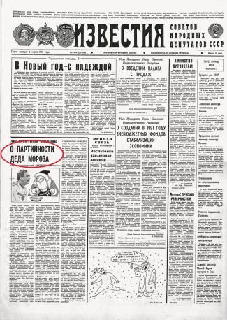 Закат перестройки чувствуется в поздравлениях «Известий» от 1990 и 1991 годов. Один из новогодних номеров содержит указ Михаила Горбачева о создании внебюджетных фондов стабилизации экономики вместо поздравлений первого лица государства, а самым ярким получился материал «О партийности Деда Мороза». В связи с появлением многопартийности в СССР известинский Дед Мороз в очерке мучительно решал, куда ему податься, но в итоге остался беспартийным и вне политики.