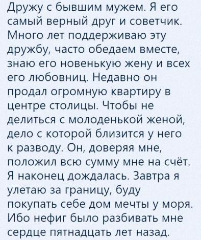 1. "Пара развелась, потому что муж научил их попугая ругательствам в адрес жены. Попугай остался с ним" 2. "У колеги был случай, когда при разводе не было проблемы с дележкой денег, но была проблема с детьми. Ни один из родителей не хотел забирать их себе" 3. "Знакомый развелся с женой после 2 месяцев брака, потому что она спала со включенным ночником, а он мог спать только в полной теноте. Видимо, они не жили вместе до брака. Он так ненавидел свет ночника, что часто спал на диване в другой комнате, а иногда выставлял жену из спальни и спал там сам в темноте" 4. "Жена решила развестись с мужем, потому что он выгуливал их собак, когда она была на работе, и в итоге собаки любили больше его" 5. "Больше 20 лет работаю адвокатом по разводам. Видел всё. Однажды я представлял мужчину, который разводился с женой после более 35 лет брака. Им было далеко за 60. Во время переговоров они всего за полчаса поделили около полумиллиона сбережений, но целых 2,5 часа ссорились из-за двух бокалов! Она говорила, что это подарок ее отца, а он утверждал, что сам купил эти бокалы" 6. "Недавно молодая пара развелась после двух лет брака, потому что муж раскармливал собаку. Собака реально стала толстой. Видимо, жена представила, что то же может быть с их будущими детьми" 7. "Пара около двух часов не могла решить, кому достанутся оставшиеся в холодильнике продукты. Еды там было долларов на 40, но мы потратили два часа времени, которое обошлось паре в тысячу долларов, а все в основном из-за банки арахисового масла" . "Пара развелась из-за кошки. Жена называла ее Снежкой из-за белой шерсти и хотела кормить ее натуральной едой. Муж называл кошку Лилией по той же причине и хотел кормить только сухим кормом. Они спорили из-за этого в суде около года, но совсем не обсуждали опеку над тремя детьми" 9. "Один из моих клиентов думал, что жена ему изменяет. А она просто по ночам гонялась за покемонами на своей машине. Но они все равно развелись" 10. "46-летний брак закончился, потому что школьная любовь мужа осталась одна и он женился на ней в день своего развода" 11. "Она просто очень громко чавкала и он не мог вынести этого" 12. "Однажды я представлял клиента, который был в разводе с женой, но они продолжали жить в одном доме, не разговаривая друг с другом. В суде они решали вопрос о том, как делить полки в холодильнике"