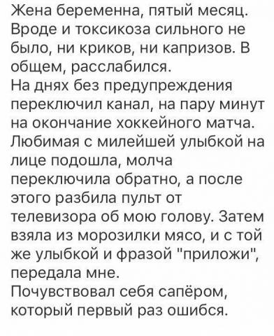 А отец-то уже сделал мысленно ремонт, установил кроватку, составил меню, где 100% витаминов. Он приготовился не спать до 2024-го года. В четвёртый раз отучился в школе, (тоже мысленно). Вырастил из сюрприза хоккеиста или балерину.