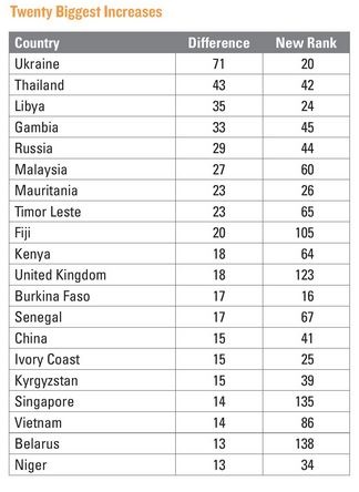 Таким образом, Украина показала наибольший рост среди потенциально проблемных стран в данном контексте, обогнав в рейтинге, к примеру, Северную Корею (51 место), Ливию (24 место) и Анголу (30 место). Ближайшими соседями Украины по рейтингу оказались Индия (19 место) и Руанда (21 место).